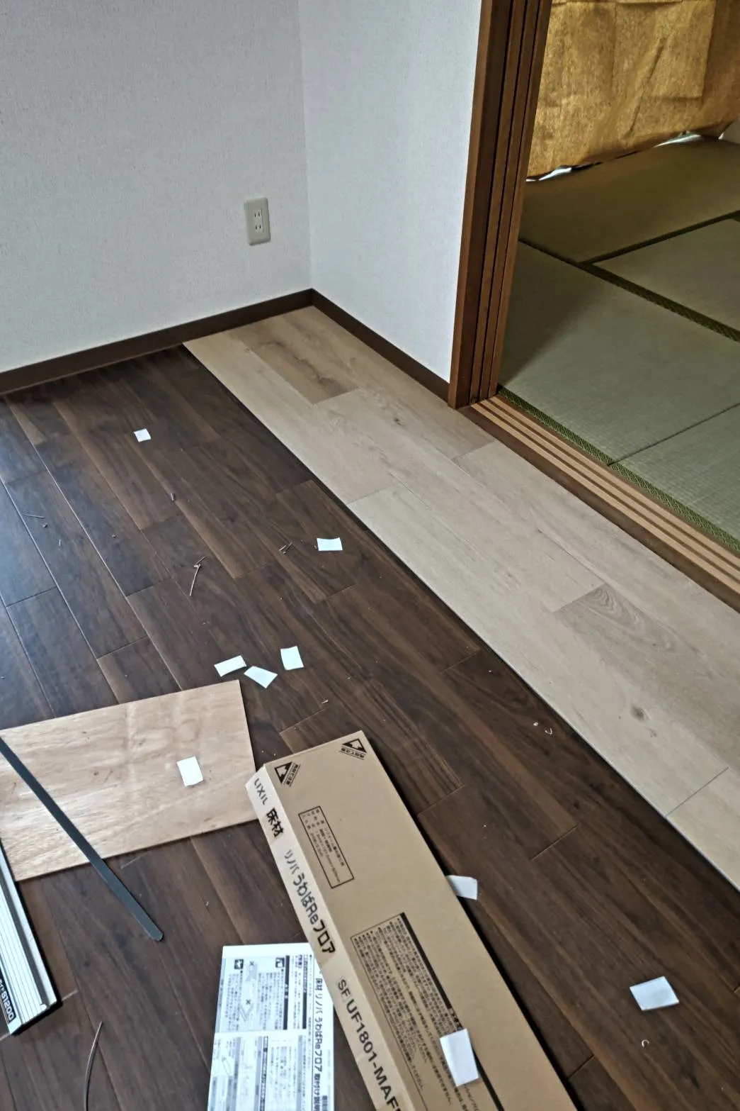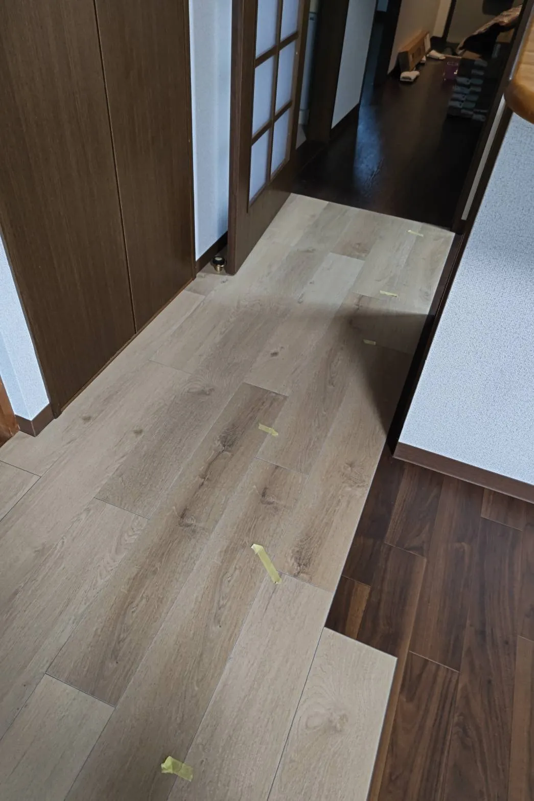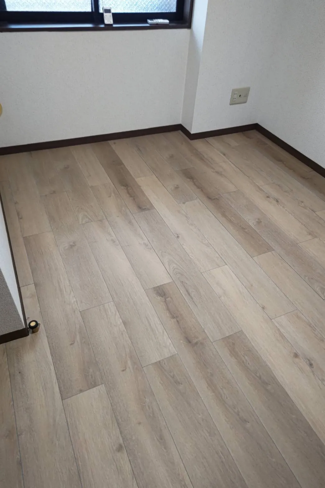 ダークブランだった床にバニラオークの床材を上貼りしました。厚みは1.8mmなので扉に引っかかる心配もいりません。